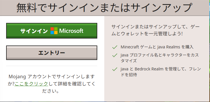 インストールしたランチャーを起動し、Microsoft アカウントでログインします。ログイン後、Java 版か統合版かを選んで「プレイ」ボタンで起動できます。