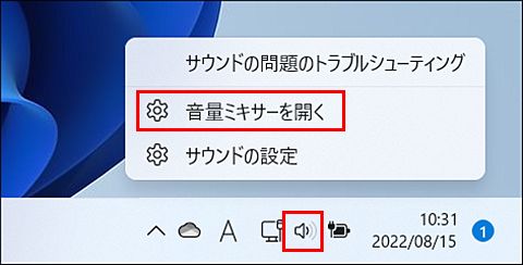- 画面右下のスピーカーマークを右クリックして「音量ミキサーを開く」を選択