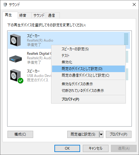 - Windows10の場合は「既定のデバイスとして設定」をクリック