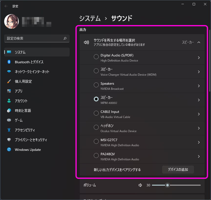 - サウンド設定画面の「出力」項目でデバイス名を確認する