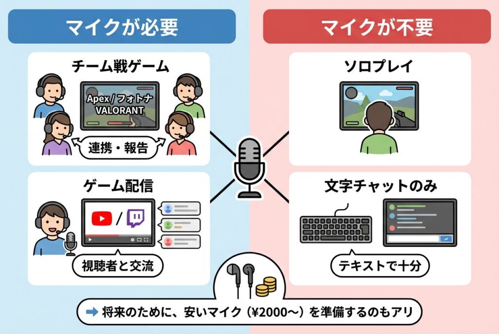 ゲーミングPCでゲームをプレイする際、マイクが本当に必要なのか迷っている方も多いでしょう。この章では、プレイスタイルや用途に応じてマイクの必要性を詳しく解説していきます。